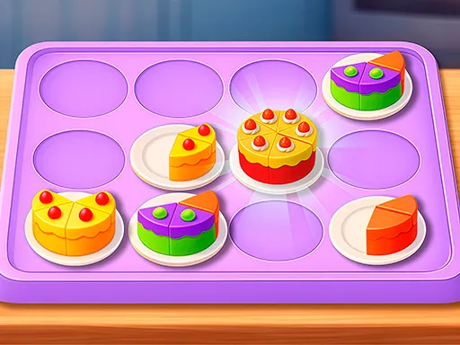 Place plates with cake slices onto the tray and position them so identical slices are next to each other. Matching slices merge automatically into a complete cake, which disappears to free up space. Plan your placements carefully so the tray doesn’t fill up. Watch out — some plates are linked and must be placed together, so save space and think ahead.